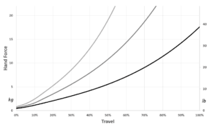 A 2-stage spring system provides resistance when pulling the lever. An initial metal coil spring simulates the pad-to-disc gap and/or slack on the handbrake cable. The travel and preload on this spring are adjustable. You can also remove this initial coil spring if you wish to do so.